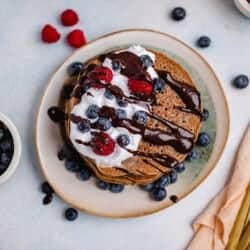 The ingredients all come together in a bowl or blender and are blended into a dough. I like to use the dough program on my high-powered blender, it really makes the dough perfect. For the topping, I put fresh berries, vegetable cream and a homemade chocolate cream on the pancakes. Click here to go directly to the recipe for the sauce.