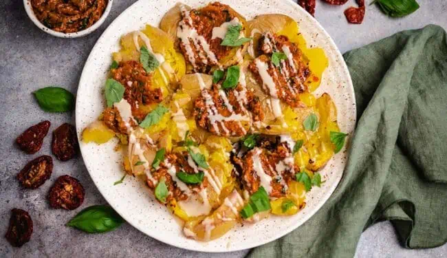 - At the end, place baked potatoes on plates, top with tomato pesto and drizzle with tahini topping. Sprinkle with fresh basil leaves and enjoy!Fresh basil leaves