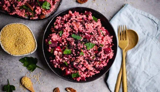 Beet millet salad sounds for many at first moment not particularly exciting. After all, we are just after Easter and for many it is back to work. Healthy dishes that are quick and uncomplicated to prepare are ideal for this. I’m talking about aromatic, nutrient-rich salads that have nothing in common with a classic green salad. Boring was yesterday, because today there is a sophisticated recipe that makes the heart of every vegan beat faster. I am in any case totally thrilled and also my husband was very positively surprised, what you can do with millet so everything. Let’s get started together.