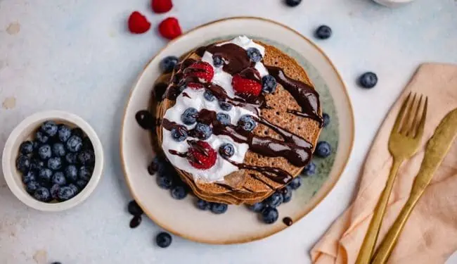 Natural sweetened, filling and natural pancakes made from precious buckwheat flour. Topped with fresh berries, vegetable cream and chocolate cream. Perfect for an extended breakfast on the weekend. Vegan, gluten-free and easy to make.