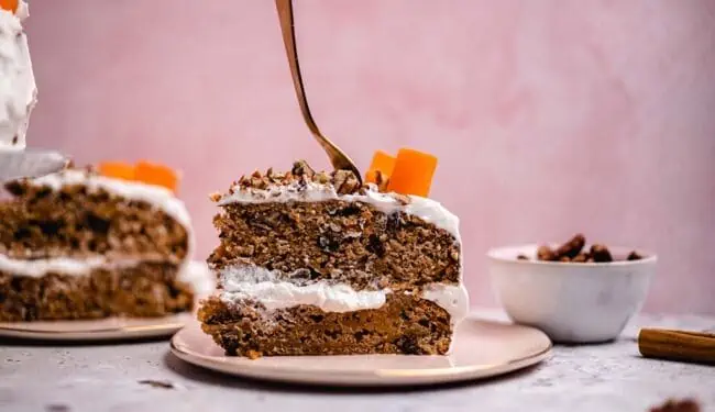 When it comes to toppings, you can let off steam to your heart’s content. I peel a carrot into thin strips and roll it up. I decorate the cake with this along with some chopped pecans and think it looks really nice. If you want to go one step further, small marzipan decorative carrots are also suitable(always make sure they are vegan quality here).