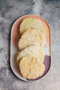 - Take one celery slice at a time, roll both sides in the gluten-free flour mixture, pull through the liquid chickpea flour mixture, and finally roll in the breadcrumbs. Set aside and continue breading until all cutlets are coated with breadcrumbs.