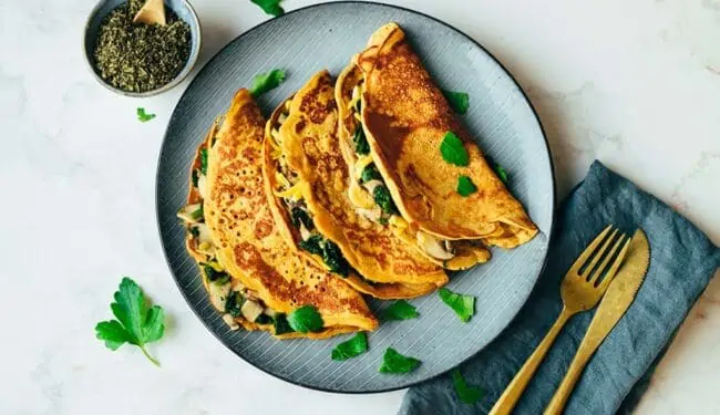 - Using a soup ladle, skim off a portion of batter and pour into pan, spreading batter evenly. Bake for about 2-3 minutesuntil the surface bubbles and is already slightly cooked through. Turn and fill with the spinach and mushroom vegetables. Sprinkle some vegan cheese on top and fold shut (see video). Remove and place on a plate.