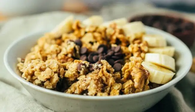 Chunky Monkey Granola is what the world was still missing. So far, to be honest, I have only ever enjoyed Chunky Monkey ice cream from a very well-known manufacturer. This is vegan and so outrageously delicious. I would also very much like to buy it more often, but the price honestly does not really tempt you to do so. Since I make my Ice cream honestly almost prefer to make it myself. This already gives me the next idea for a Recipe a Chunky Monkey ice cream. Sounds delicious, doesn’t it? But today we stay on topic Breakfast . Are you more the sweet or savory type at the Breakfast ? I love it sweet and only make an exception when it goes to brunch. It can also be a slice of bread with a hearty topping. Feel free to drop me a line in the comments, I’d love to hear from you.