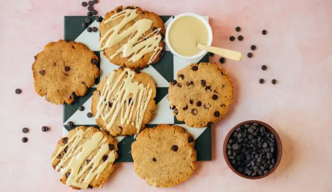 - Using your hands and a spoon, separate 12 even portions. Form into balls, place on baking sheet, flatten and shape into cookies. Decorate with extra chocolate drops as desired.Dark vegan chocolate drops
