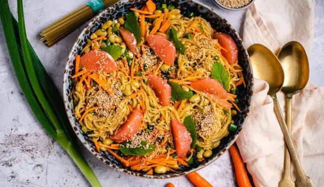 The salad is quickly assembled from gluten-free Asian noodles, edamame, carrots and scallions. The dressing is also ready in no time from sesame oil, tamari, rice vinegar, maple syrup and grated ginger. That is also almost everything. Now all that’s missing is the topping of mint leaves, grapefruit and sesame seeds. Are you ready for this delicious salad?