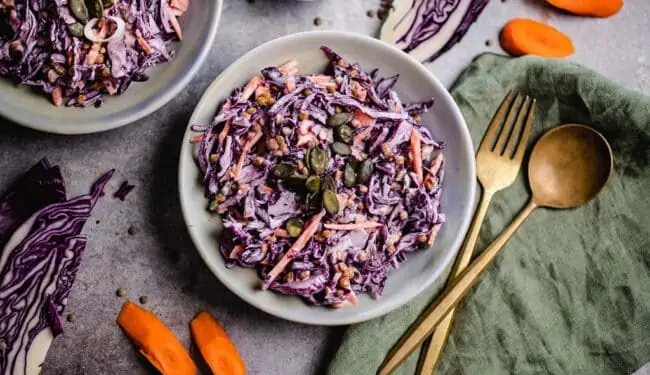 Basically, the salad consists of red cabbage, carrots and lentils. Add to this a fine dressing of cashews, oat milk, lemon juice, yeast flakes, mustard and garlic granules. All this is finely mixed and mixed with the vegetables.