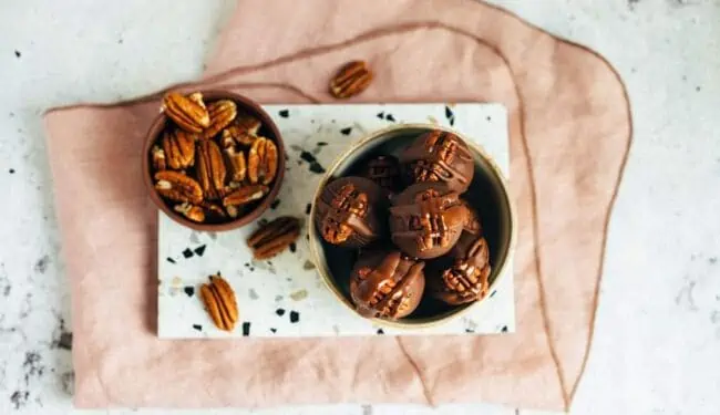Extremely delicious, naturally sweetened, vegan chocolates made from roasted pecans, dates and crunchy chocolate. Perfect as a small snack with coffee or dessert. Chocolatey, nutty, high in fiber and oil-free.