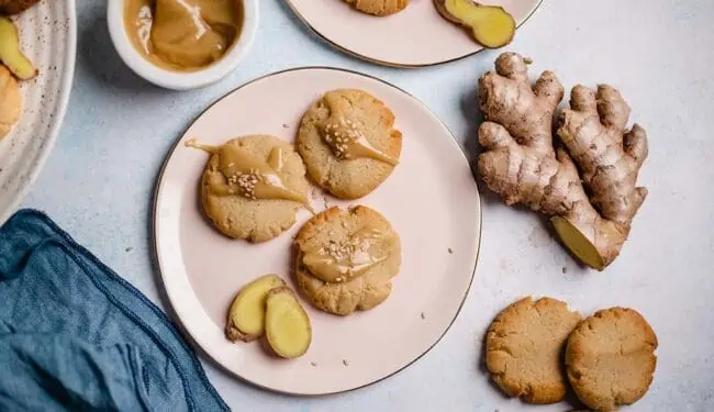 Already during the baking time they exude a fine ginger scent and you can hardly wait to finally eat them. I made a little extra topping to dress up these fine little beauties. A tahini caramel made with tahini and maple syrup that I use to top the cookies.