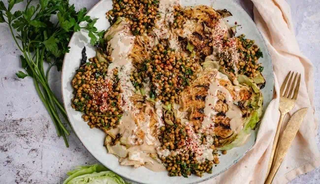 Vegan grilled white cabbage steaks with chimichurri lentils