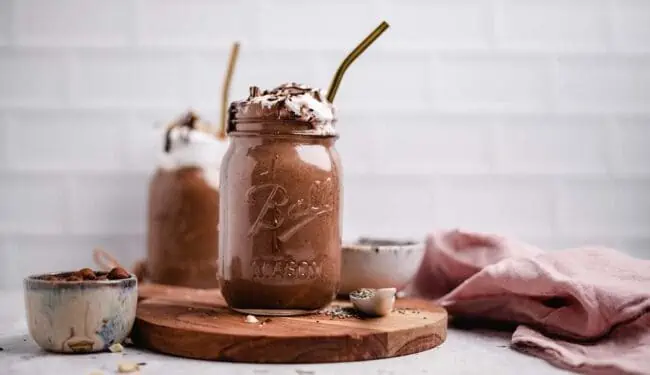 - Pour into two smoothie glasses, garnish with desired toppings and serve.Vegetable cream, Hazelnuts chopped, Chocolate