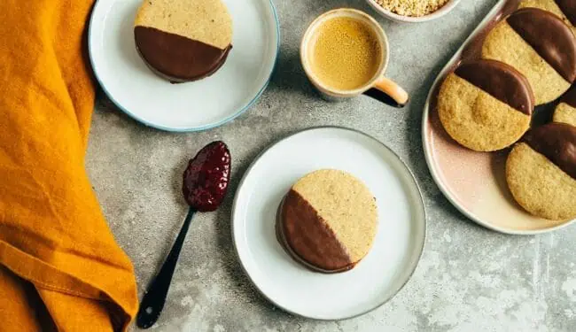 Hazelnut taler with jam filling and dark chocolate coating