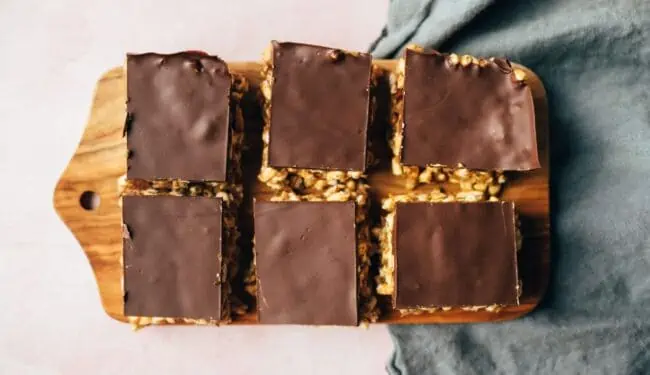 Puffed rice, nut butter, hemp seeds, maple syrup, bourbon vanilla and a pinch of salt. No, that’s all it will be. Mix everything once and then put it in the mold. Flatten, press and melt the dark vegan chocolate on the side. A little more Nut puree with the melted chocolate and coat the base with it. Let cool and you are ready to go!