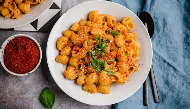 Delicious vegan hummus pasta topped with homemade Korean gochujang sauce.