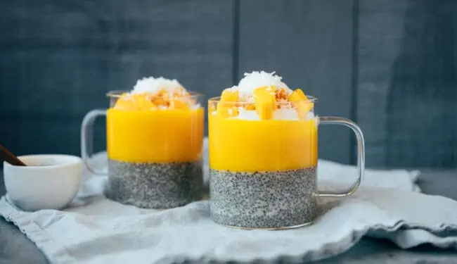 - Spread puree over chia pudding, optionally garnish with coconut yogurt, remaining mango pieces and coconut flakes. enjoy!Coconut yogurt, Mango cubes