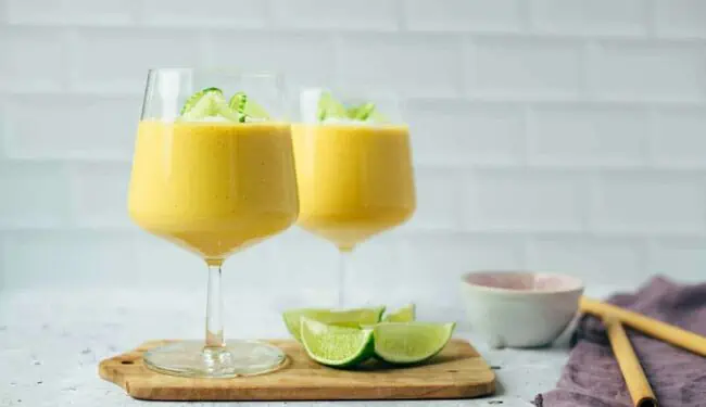 - Serve with a spoon and a reusable straw and enjoy immediately!Lime slices, Extra yogurt, Coconut shavings
