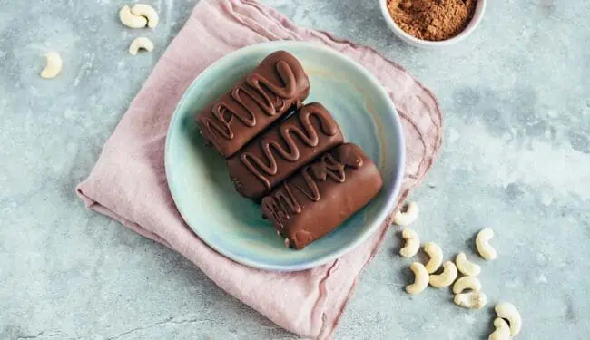 • Pour chocolate into a tall glass, skewer bars one at a time with praline cutlery or two wooden skewers, and cover with chocolate. Work quickly, because the chocolate quickly attracts and forms a thick layer.