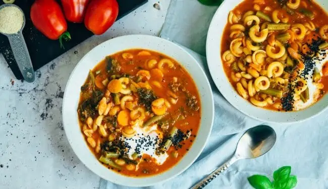 Nourishing vegan soup with lots of vegetables and delicious pasta