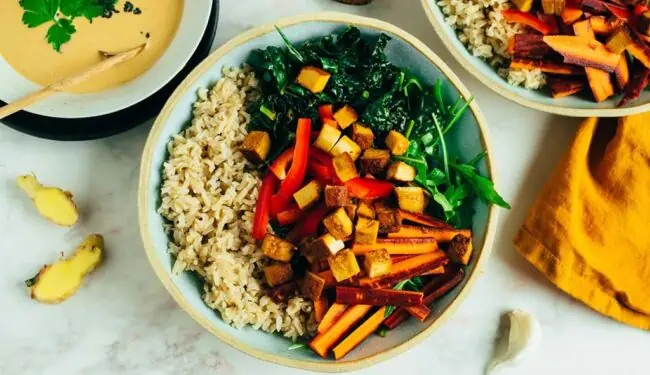 Whole grain rice, arugula, fresh carrots, bell peppers, roasted tofu cubes, black kale and an irresistible miso dressing. It’s all in this filling and healthy bowl.