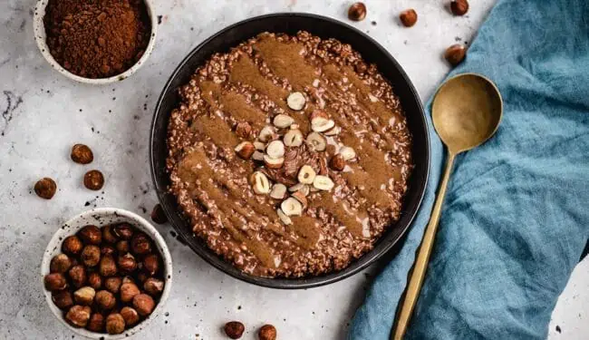Nutella Overnight Oats are simply something fine. I would love to eat them every day, but sometimes it can be a little variety. There are already some vegan breakfast ideas here on the blog. By the way, have you seen that all articles are now also available in English? Gladly pass the word and thanks also to my husband for the translation work, because it took him a few hours. These Overnight Oats are quickly stirred together and then allowed to sit in the fridge for a night until perfect the next morning. If you want to take it with you, put it in a sealable jar right away and you can pack it straight from the fridge into your bag.