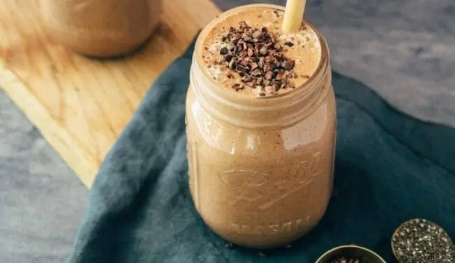 - In a high-powered blender, blend all ingredients until desired consistency is reached (I like it very fine).240 g Bananas, 64 g homemade Nutella or bought in organic quality, 2-4 Dates, 10 g Cocoa powder, 10 g Chia seeds, 480 ml Almond milk