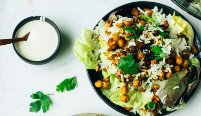 - Arrange leaf lettuce in a large bowl. Spread cooked rice on top. Pour chickpea-almond mixture on top.170-200 g mixed green salad, 200 g Cooked rice
