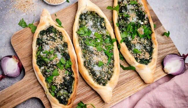 Pide with spinach and feta I could eat every day. Crispy on the outside and filled with fine spinach and vegan feta cheese on the inside. Especially the pizza dough with the crispy crust is always the absolute highlight for me personally. If then spinach and vegan Greek cheese is included, then there is no stopping me. I remember so well the last time I was in Istanbul and ate a vegan version. Finally there is also a variant on my blog.
