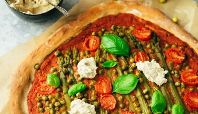 - Spread tomato sauce evenly with a spoon. Decorate with asparagus, peas and cherry tomatoes as desired. Place in oven and bake for about 20-25 minutes, until edges are golden brown. Remove from oven, finish with ricotta, parmesan and basil, portion and enjoy!30 g vegan ricotta, 250 g green asparagus, 150 g Peas, 75 g Cherry tomatoes, Fresh basil, Vegan ricotta to taste, Vegan Parmesan cheese to taste, Pizza seasoning