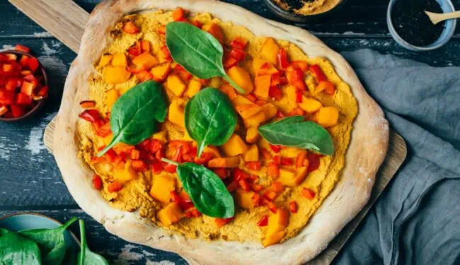 Crispy base topped with hummus, diced pumpkin, bell peppers and fresh spinach, this vegan pizza yoga is so delicious.