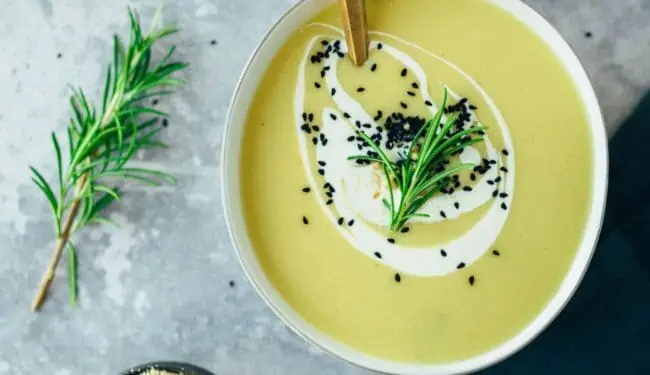 Let’s start with the list of ingredients. A little frying oil, garlic, onion, leek, potatoes, deglazed with vegetable broth and seasoned with cumin, bay leaf, a pinch of nutmeg, sea salt and pepper. After cooking time, it’s off to the blender, along with a small handful of Cahew nuts which provide a gigantic creaminess. I puree my soup in the Blendtec (advertising since brand name, but bought myself) and use the soup program.