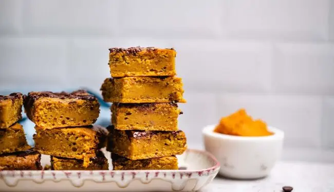 Maybe you’re wondering what blondies actually are. Everyone knows brownies and I think you might be a big fan of them too. Blondies are, as the name suggests, the light version of a brownie, without cocoa or chocolate. In our case, pumpkin puree is just added and the treats get a beautiful, slightly orange-yellow color. Since I didn’t want to completely forgo chocolate, I opted for a chocolate drops topping.