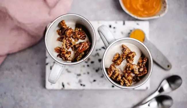 For this delicious and easy recipe, I came up with another delicious topping. Directly over the cup cake I give a dollop of vegan vanilla curd and top that with caramelized pecans at the end. For this I put a handful of Pecans in a hot pan, toast them briefly and then add maple syrup. After 2 minutes, the caramelized nuts are ready and go straight into the cup. Anything left over nuts can be snacked on the same way.