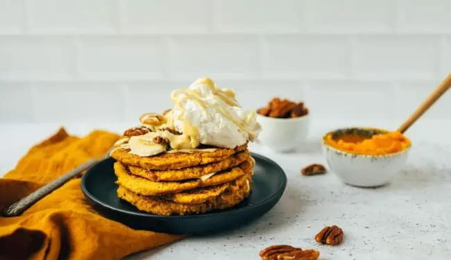 - For the batter, provide a high-powered blender (or bowl) and pour in all ingredients in order, Blend with a wooden spoon until smooth, which should be much creamier and firmer than regular pancake batter.150 g Oatmeal, 60 g Pecan kernels, 250 ml Almond milk or another vegetable milk, 120 g Pumpkin puree, 30 g Coconut blossom sugar, 1 tbspn Baking powder, 1 tbspn Pumpkin spice**, 1 strong pinch of sea salt, ½ tbspn Bourbon vanilla ground or vanilla extract, Some high heat oil for baking