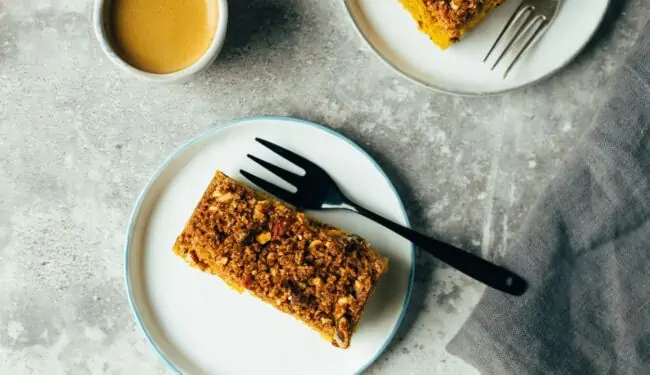 Autumn cake with fine pumpkin puree topped with crunchy sweet nut crumble