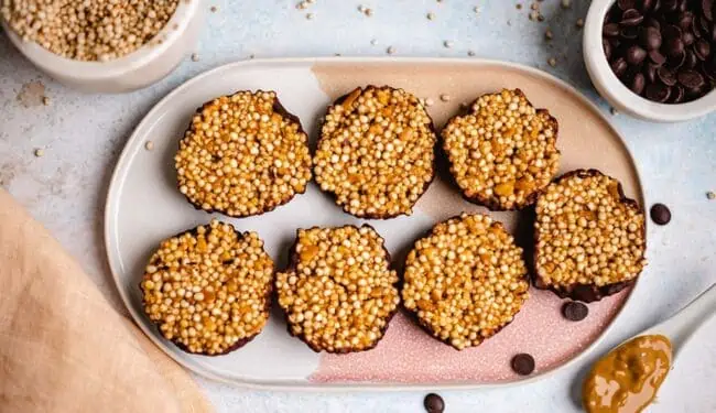 You can’t really go wrong with this recipe, however there is one thing that is a little tricky and that is filling and flattening the quinoa mixture into the ramekins. For this purpose, your fingers should be slightly moistened, otherwise the dough will stick easily. Also, be sure to solidify the quinoa bites in the freezer before coating with chocolate. Otherwise, they are too soft and difficult to remove from the molds. But that’s all and the rest is really easy.