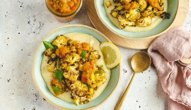 Roasted cauliflower on mashed potatoes and mango chutney