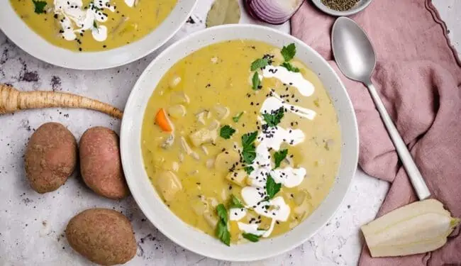 Autumn vegan soup with fine root vegetables and aromatic herbs. Parsnips, salsify and parsley root meet fine vegetable cream and aromatic spices