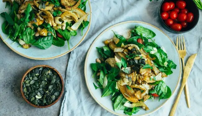 Salad with roasted Fennel from the oven. When I look at the weather forecast so, then it is again high time for fresh and colorful Salad creations . The temperatures are beyond 20 degrees in one fell swoop and you almost want to get your bikini out of the closet and walk barefoot through the grass. Bye bye Soup time and hello Salad time . I’m still dreaming of a really great permaculture garden where I can always get fresh salads and Vegetables harvest. However, as long as that is not yet the case, I buy my Salads super happy at the Ökokiste or in the organic supermarket. What I especially love is baby spinach with its tender, fresh leaves. Yummy! Well, are you ready for a great salad with delicious roasted fennel ? I certainly do, then let’s get started.