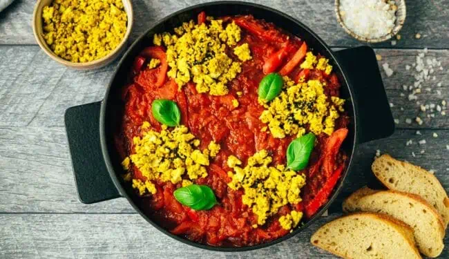 Israeli delicacy made with a tomato and bell pepper sauce, topped with vegan scrambled tofu. Delicious with fresh herbs and bread for an extended Sunday breakfast or brunch. Vegan, gluten-free and suitable for a low-carb diet.