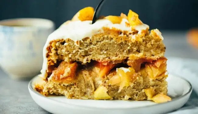 Once the base of fine sponge cake, then a filling of caramelized apples and decorated with a fine Frosting from cashews , yogurt, lemon juice, lemon zest, vanilla, maple syrup and a pinch of salt. Wait, I forgot one thing! Xanthan gum, my favorite binder in the vegan cuisine . Be sure to get a pack of these. It is a natural bacterium that creates a super bond even in cold dishes. I have linked you my favorite product below in the ingredients.