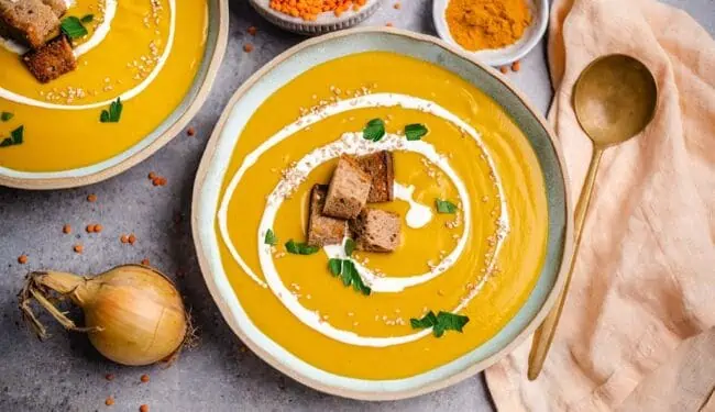 Soup with sweet potatoes and red lentils is a real boon for cold and uncomfortable days like these. They are uncomfortable mainly because you virtually do not get to see the sun. Maybe you’re luckier, but in our latitudes you can count the hours of sunshine in recent months on one hand. This is exactly why I love soups in bright colors, like this delicate, creamy version with red lentils and sweet potato. Admittedly, I wasn’t always a big sweet potato fan, but since I’ve been eating a plant-based diet, it’s been making its way onto the table more and more often.