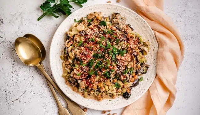 - Provide a large salad bowl, add roasted eggplant and chickpeas, dressing, green onion, edamame, sesame seeds and chili flakes. Mix well until everything is evenly combined and refrigerate and infuse for at least 4 hours, but preferably overnight. Just before serving, sprinkle with fresh parsley and enjoy!