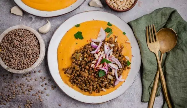 - Divide puree among plates, the lentils and finish with fresh parsley, pine nuts, red onion or other toppings of choice. enjoy! Store leftovers in an airtight container in the refrigerator for up to 5 days (without puree) or freeze.Mashed potatoes, Fresh parsley, Pine nuts, Red onion