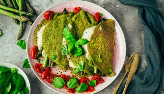 Spinach crêpes with mozzarella and green asparagus (gluten-free)
