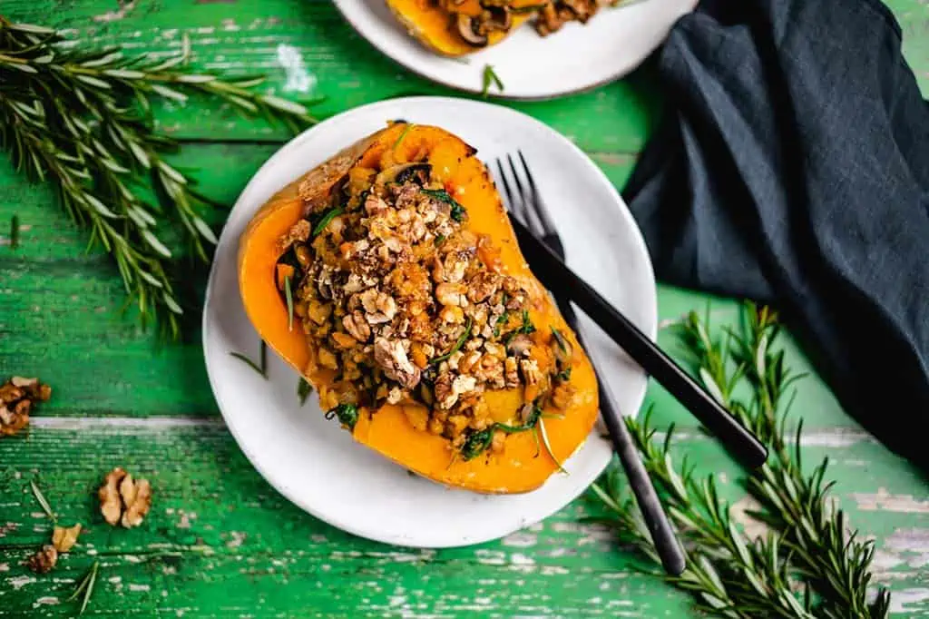 Stuffed butternut squash has been on my list for a long time and it’s finally here. Autumn has many beautiful sides and one of them are the wonderful pumpkins. Admittedly, I didn’t spend that much time on the versatile vegetable in the past. However, since going vegan, I have a lot more different and sometimes new vegetables on the menu. The butternut squash is right up there with the rest.