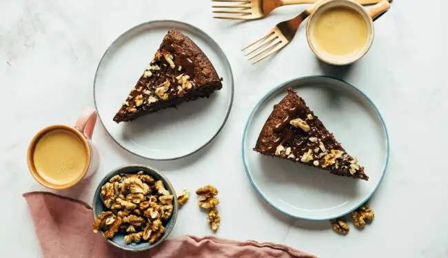 Simple, moist and fluffy Swiss walnut chocolate cake, gluten-free. Perfect for any vegan coffee gathering, along with a cup of tea or coffee.