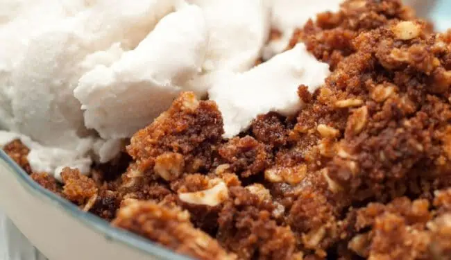 - In the same bowl add all the ingredients for the topping and mix well. Over the apples and put in the oven for 50-60 minutes. The crisp is ready when the apples are nicely soft, the filling has formed bubbles and the edges are beautifully golden brown.a pinch of nutmeg, 90 g Oatmeal, 55 g Almond flour, 68 g gluten free flour mix, 96 g Coconut blossom sugar Coconut blossom sugar, 110 g Cane sugar, 50 g Pecans, 1 g Sea salt, 2 g Cinnamon, 120 ml Coconut oil