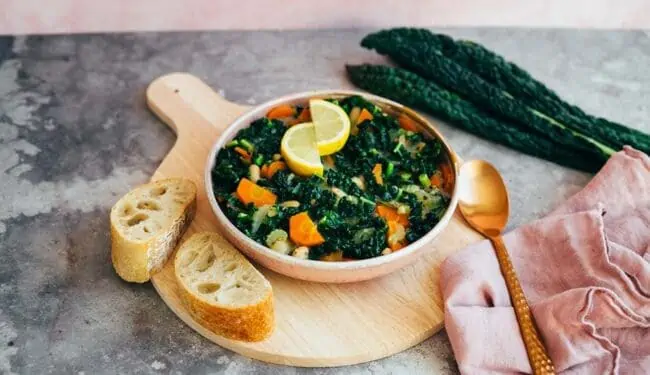 Let’s start with the ingredients. A little frying oil, garlic, onion, celery, carrots and white beans, deglazed with vegetable broth and seasoned with Italian herbs, sea salt and pepper. Just before the cooking time is up, I add black cabbage for an extra nutritional kick. Alternatively, ordinary kale is also suitable.