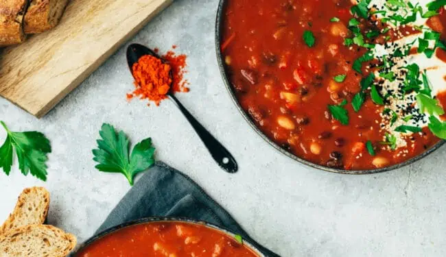 Refine our Chili easily with soy cream, vegan cheese or yogurt. Serve with a delicious baguette or whole wheat bread, basmati rice, quinoa or just enjoy it plain (trust me, it’s incredibly filling).