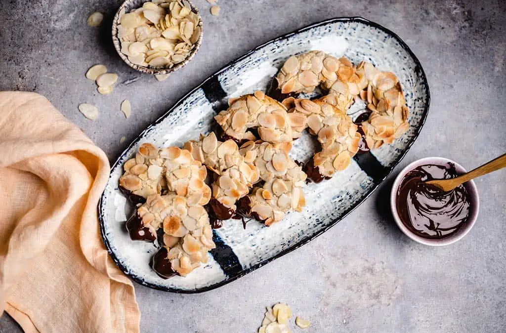 Our almond croissants today are really quick to make and you don’t need a lot of baking experience to make them either. A food processor, some time and patience, an oven and a handful of ingredients. Ground almonds, flour, raw cane sugar, starch, marzipan, bourbon vanilla and vegetable milk. For decorating you still need almond flakes and dark vegan chocolate.